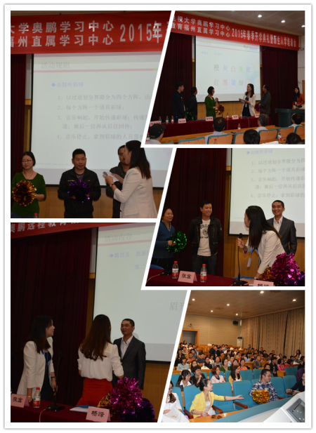 会上福建电大远教中心兼奥鹏学习中心主任雷乃旺发表了热情洋溢的欢迎致辞,奥鹏华南区张宏总监向新同学们提出了殷切的期望,老生代表郑娴靓、新生代表叶桐林同学分别分享了他们的学习经验和入学体会,会中还进行了新生与班主任的见面仪式。会议最后一个趣味活动环节中,同学间配合默契,师生间互动风趣,欢乐的气氛将开学典礼推向高潮。