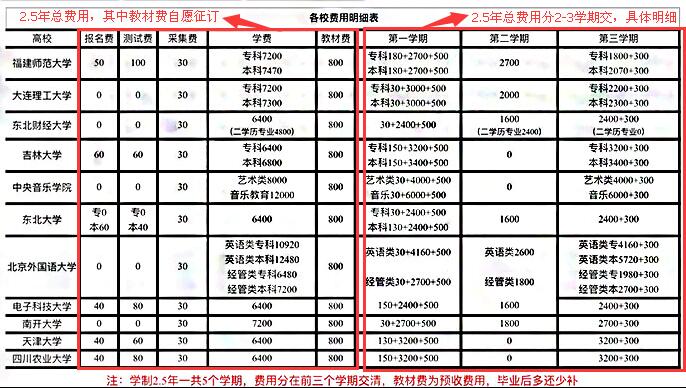 以下各校费用明细表:比如报读福建师范大学(专科),报名费50元,测试费100元,照片采集费30元,2.5年总学费专科7200元(分3学期交)第一学期学费交2700元,第二学期学费交2700元,第三学期交1800元,课本费800元分2次交(500元+300元,课本教材自愿征订)如果还有不懂的话可以在线咨询专业老师。