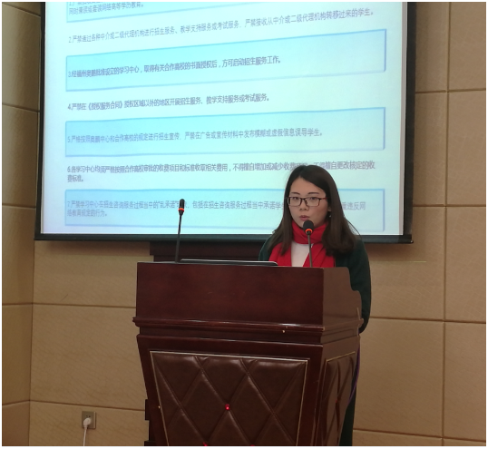会中,奥鹏远程教育福州学习中心常务副主任张文新、副主任姜学奇、市场部副主任江丽萍老师与教学教务部副主任江燕老师,分别就学习中心发展规划、《奥鹏远程教育福州学习中心招生、教学教务、考务工作管理办法》、2018年的招生政策及高校学务考务作了大会发言。